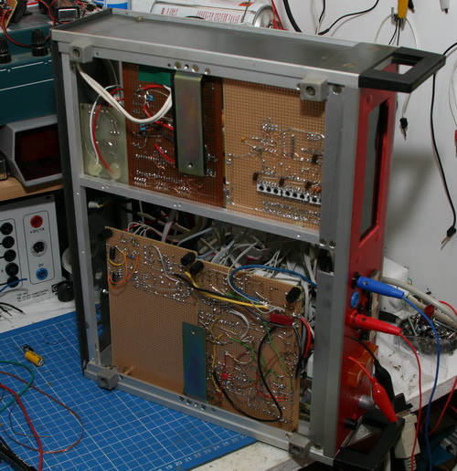 Ansicht von Unten, man erkennt gut die einzelnen Module (Analogplatine, Analogplatine mit schwingenden Teilen (C/L-Messung, ESR-Messung), Platine mit Relaisansteuerung Platine mit Netzteil und Mikrocontroller, Platine mit zusätzlichem Netzteil für serielle Schnittstelle und externe Erweiterungen)